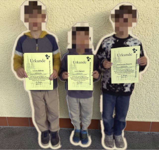Drei Kinder der Klasse 4 a haben an der 2. Runde des Mathematik-Wettbewerbs der Grundschulen in Köln teilgenommen und zweimal den 3. und einmal den 2. Platz belegt. Eine tolle Leistung, wir sind stolz auf unsere Mathe Jungs.