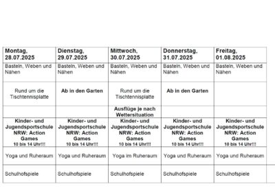 Dazu: Basteln, Yoga und die Kinder- und Jugensportschule NRW mit einem Action-Programm täglich in der Turnhalle!!! Wir freuen uns darauf!!!