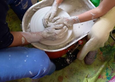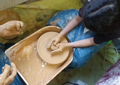 An der KGS Trierer Straße ist beim OGS-Herbstferien-Programm immer viel los! Es hat schon ein großes Kino-Event im ODEON-Kino gegeben, das Sport-Angebot hat mit den „Action-Games“ viel Power und raus in den Park geht es auch. Was aber ein großes Highlight ist, ist das Arbeiten mit Ton. Eine knifflige Angelegenheit- vor allem auf der Drehscheibe. Dann noch Farben und Glasuren drauf und der Brennofen läuft auch schon heiß!